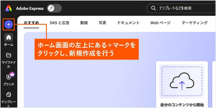 Adobe Expressにログインした後、ホーム画面の左上にある+マークをクリックして、新規作成を行います。