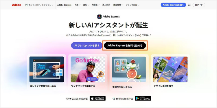 まずは、ブラウザーでAdobe Expressにアクセスし、GoogleアカウントやLINEアカウント、メールアドレスを使って無料でログインしてください。登録は30秒ほどで完了します。