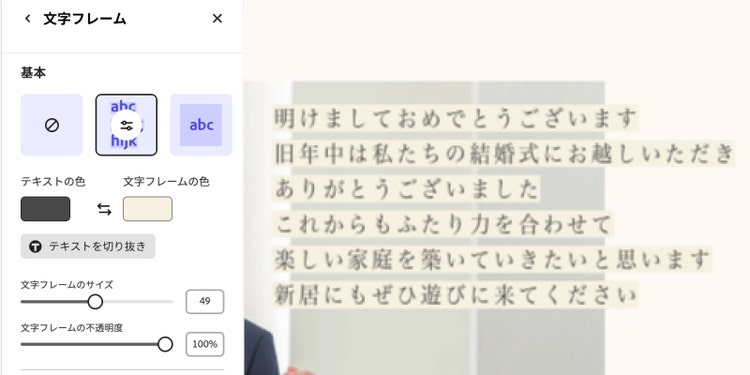 今回のように、写真の上に挨拶文を記載する場合、写真とテキストが同化して読みにくくなることがあります。そんなときは、ツールバーの「文字フレーム」でテキストに背景を付けるのもオススメです。