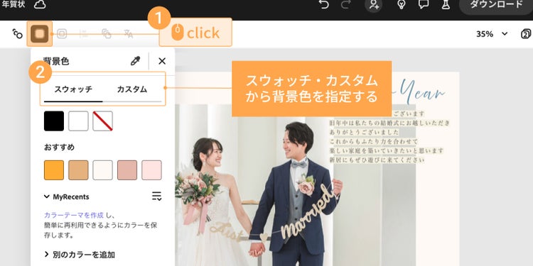 背景色を変更したい場合は、「背景色」をクリックしましょう。「スウォッチ」から色を選べるほか、「カスタム」からはスポイトで画面上の色を抽出したり、色コードを指定したりできます。