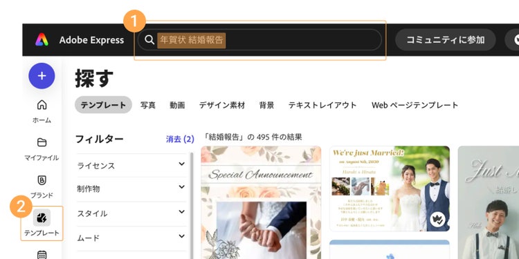 Adobe Expressの「年賀状 結婚報告」のテンプレート検索結果