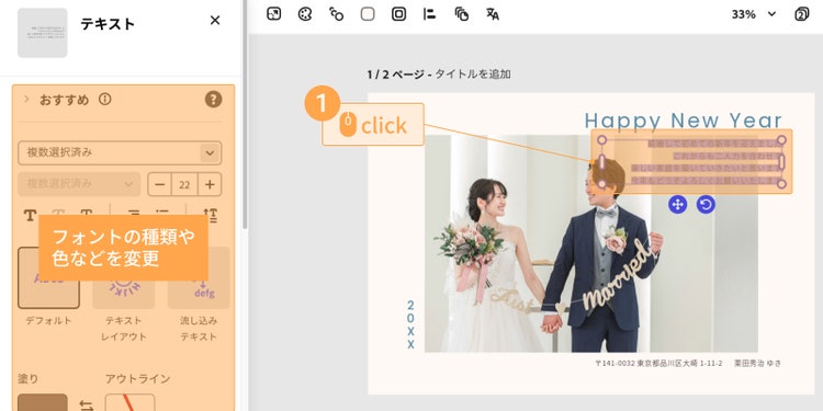 次に、挨拶文や住所・氏名などのテキストを変更します。変更したいテキストボックスをダブルクリックして、内容を編集してください。