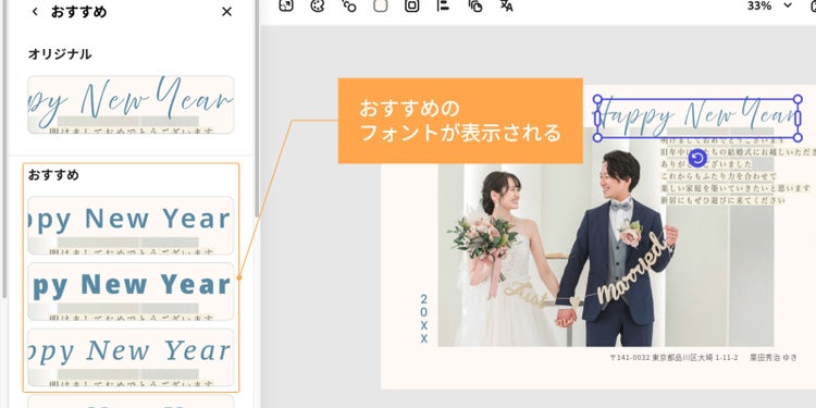 また、テンプレートの雰囲気に合うフォントを教えてくれる機能も用意されています。様々なフォントを試しながら、イメージにぴったりなものを選びましょう。