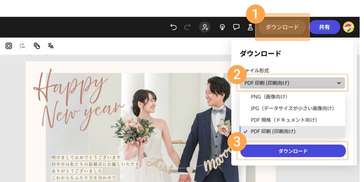 各要素の位置や大きさなどの調整が済んだら、ダウンロードボタンをクリックし「PDF印刷」を選んで年賀はがきに印刷しましょう。