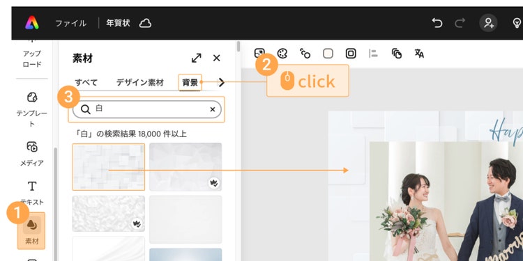 背景画像を変更する場合は、まずカンバス全体を選択した状態にします。「素材」>「背景」の順にクリックしてイメージに近い背景画像を探しましょう。検索窓にキーワードを入力するほか、「自然」や「季節の素材」などのカテゴリーからも探せます。
