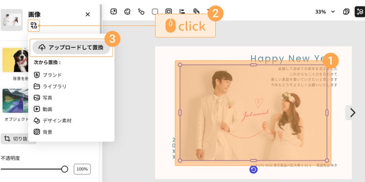 変更したい写真を選択したら「置換」ボタンをクリックしてください。手持ちの画像に変更したい場合は「アップロードして置換」を、Adobe Expressで提供されている素材を使う場合は「写真」や「デザイン素材」などをクリックしましょう。