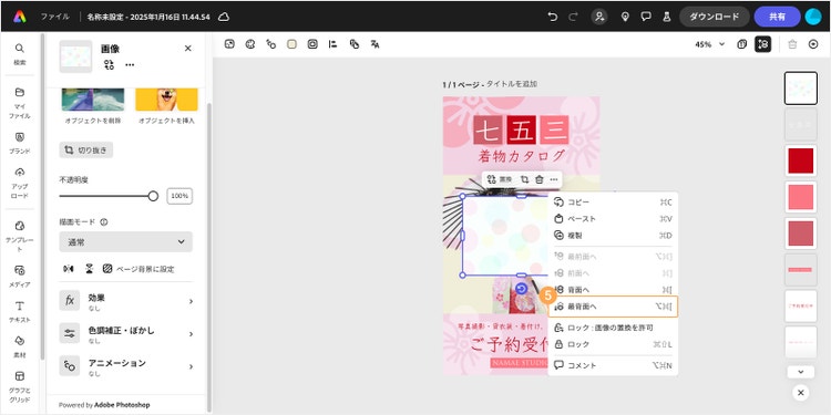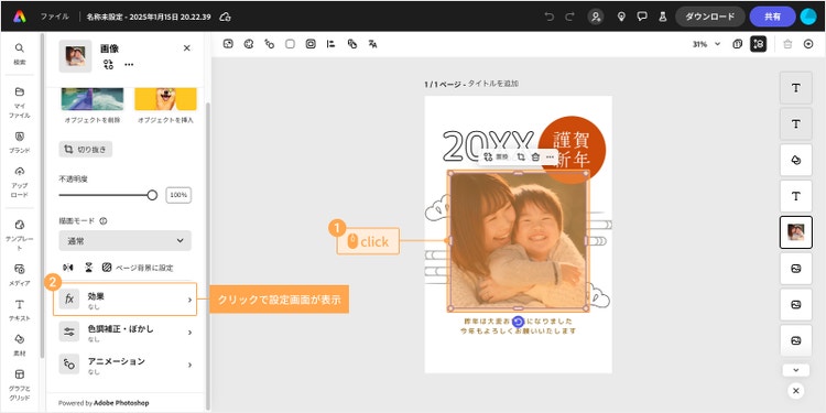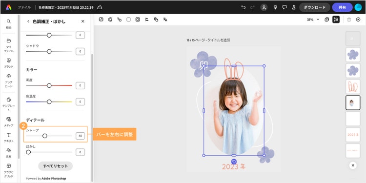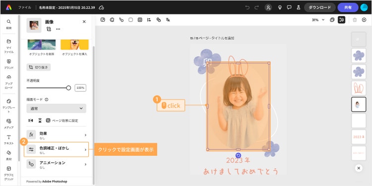 カードに挿入する画像の明るさや鮮やかさも、Adobe Expressを使えばカンタンに調整できます。