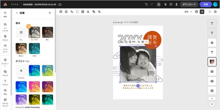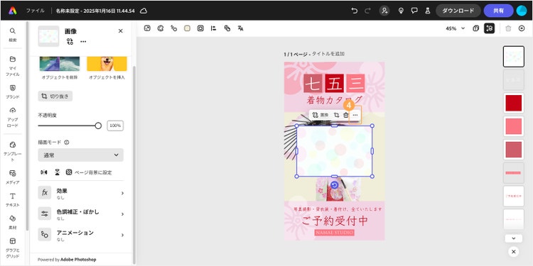 Adobe Expressなら、こうした背景や写真の色、質感の調整もカンタンです。それでは実際に、Adobe Expressを使って写真付きのメッセージカードを作る手順をご紹介します。