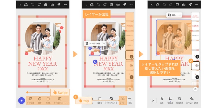 テンプレート内の画像を自分のスマホに保存されている写真に差し替えてみましょう。テンプレート内の画像を選択し、青い枠線が表示されたら、下部の「置換」を選びます。画像が複数重なっているテンプレートの場合は下部のツールバーの「レイヤー」をタップすると、差し替えたい画像を選択しやすくて便利です。