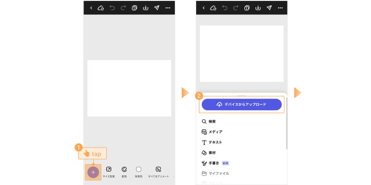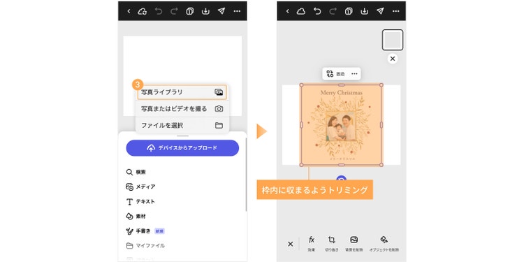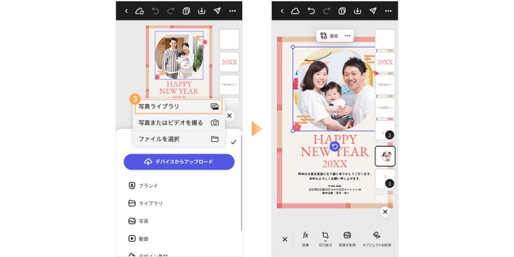 画像が選択できたら、「デバイスからアップロード」をタップし、「写真ライブラリ」「写真を撮る」「ファイルを選択」のいずれかから、使いたい画像を選びましょう。画像のアップロードが完了すると、テンプレートに元々入っていた写真と置き換わります。