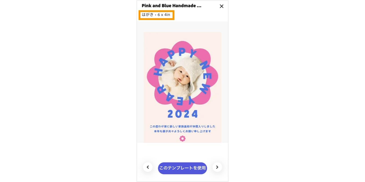 テンプレートをタップし、上部に「はがき・6×4in」もしくは「はがき・4 ×6in」と表示されているテンプレートを選ぶと、見切れずにプリントアウトできます 。