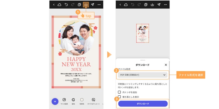 ダウンロードした画像をはがきに印刷する場合は、「ファイル形式」から 「PDF印刷(印刷向け)」 を選んで保存すると見た目の崩れがなく、きれいに仕上がります。なお、「PDF」はアドビが開発したファイル形式で、使用環境に関係なく文書や画像を表示でき、データを共有する際にも便利です。