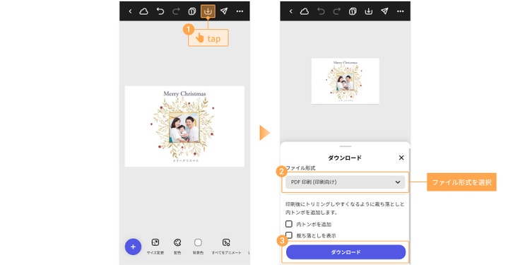メッセージカードが完成したら、編集画面上部のダウンロードボタンをタップして保存しましょう。