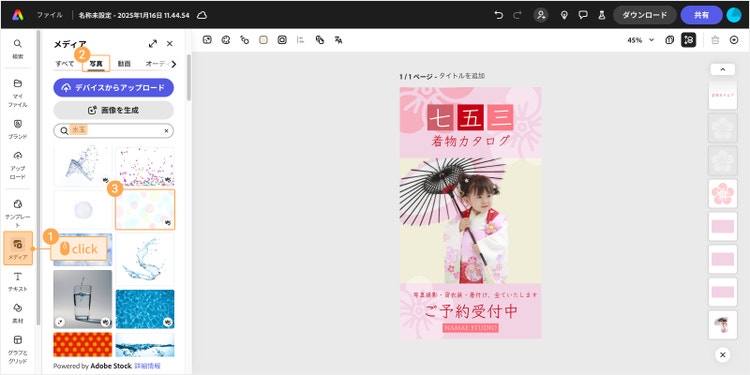 画面左の「メディア」をクリックし、「写真」から背景にしたい画像を選んでください。もしくは「デバイスからアップロード」をクリックし、画像を追加しましょう。