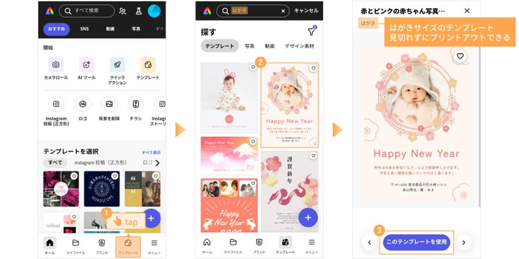 テンプレートを使って画像を作成する場合、下部のツールバー内「探す」から「テンプレート」をタップし、任意のテンプレートを選びます。はがきサイズに印刷する場合、検索枠に「はがき」と入れて検索しましょう。