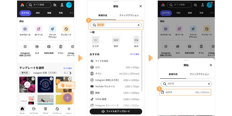 完成したデザインをダウンロードした後、ホーム画面に戻って「+」ボタンをタップし、「はがき」もしくは「サイズを設定」から新規ファイルを作成します。