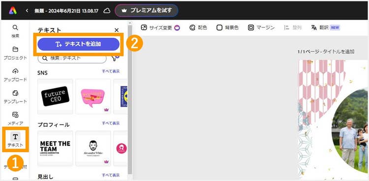 テンプレート内のテキストを変更するのではなく、あらたにテキストボックスを配置したい場合は、画面左側にあるツールバーの「テキスト」→「テキストを追加」をクリックしてください。