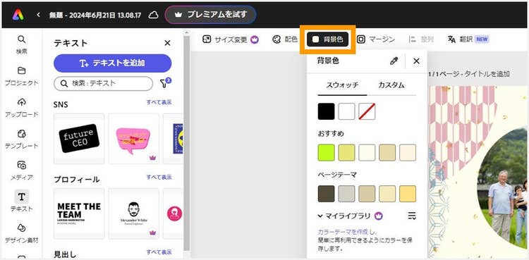 上部の「背景色」をクリックすると、背景色の編集ツールが表示されます。メッセージカードのイメージに合う背景色を設定しましょう。「おすすめ」の色から選んだり、「カスタム」や「別のカラーを追加」で色を指定したりできます。
