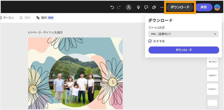 デザインが完成したら、画面右上の「ダウンロード」ボタンをクリックし、ファイル形式を選んで画像をダウンロードしましょう。