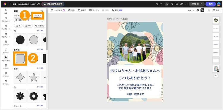 このとき、背景の柄によっては文字が読みにくくなってしまうことがあります。そんなときは「デザイン素材」メニューから「シェイプ」タブを選択し、長方形の素材を文字の後ろに配置すると、読みやすくなりますよ。