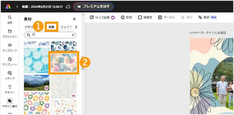 背景画像を設定したい場合は、「デザイン素材」メニューから「背景」タブを選択し、背景に使いたい素材を検索しましょう。