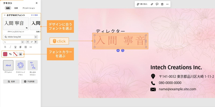 次に、変更したいテキストをクリックして、編集をします。イメージに合うフォントやテキストカラーに変更します。