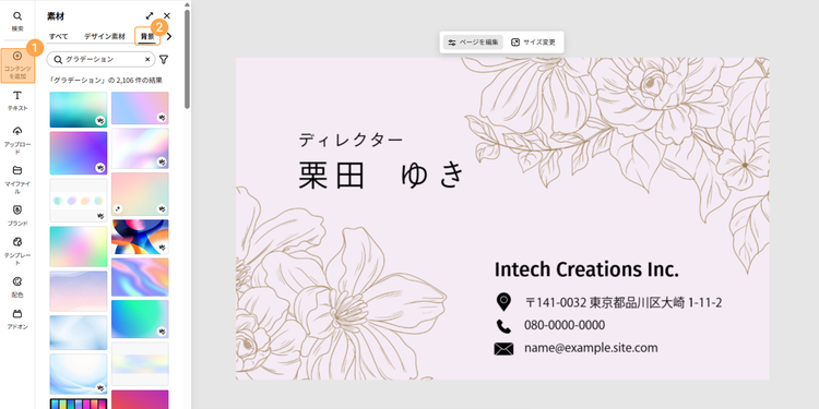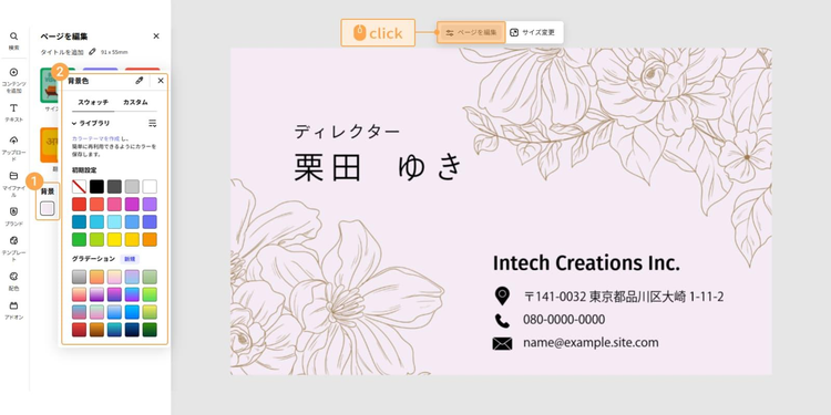 ひとつ目は「ページを編集」メニュー内「背景」の項目で色を変更する方法です。カンバス内の画像より外側をクリックすると「ページを編集」のタブが表示され「背景」のカラーを選択できます。