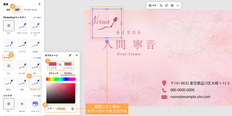 デザイン素材は「効果」>「トーン」>「ダブルトーン」で色を変更します。