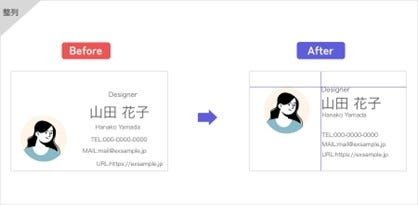 上の図でいえば、「Before」はイラストの大きさや位置がバラバラで、「果物」という同カテゴリの要素を並べていることがわかりにくい状態です。 それに対し「After」は、イラストの大きさを揃え、縦1列に並べることで、果物同士を比較しやすくなっています。