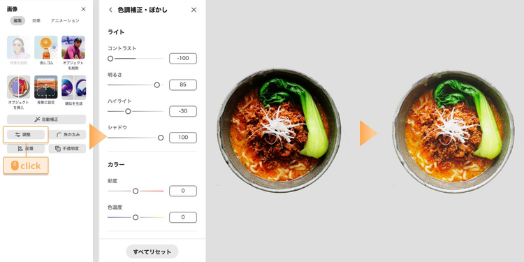 「色調補正」機能を使えば、料理をより美味しそうに見せたり、ぼやけた商品写真をくっきりとした印象に整えたりも可能です。