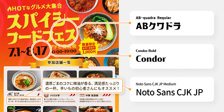 今回の作例では、その一例として「タイトル」「本文」「数字」の3つの役割に分けてフォントを使用しました。あくまで今回のデザインに合った組み合わせですが、フォント選びの考え方として参考にしてみてください。