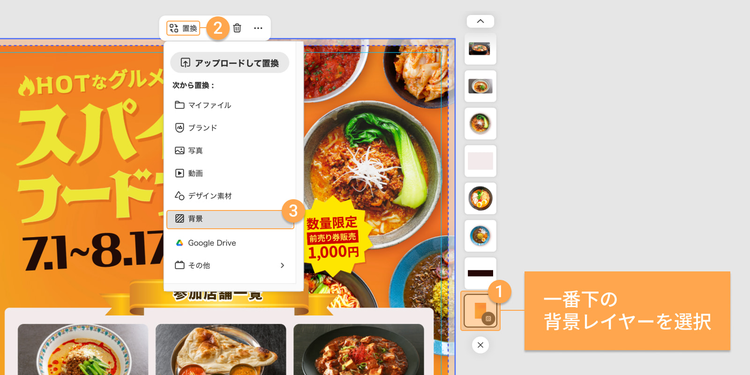 背景画像を差し替えたい場合は、背景レイヤー(一番下)を選択した状態で、「置換」>「背景」の順にクリックし、検索窓にキーワードを入力してください。