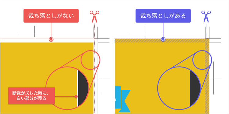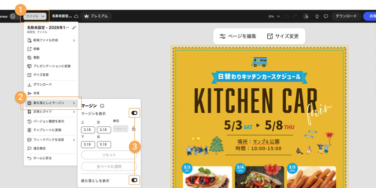 印刷時に文字や画像が切れてしまうのを防ぐため、ここでは「マージン」と「裁ち落とし」を設定します。