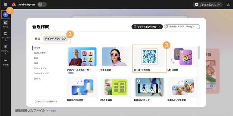 まず、Adobe Expressトップページの「+」ボタン>「クイックアクション」>「QRコードを生成」の順にクリックしましょう。