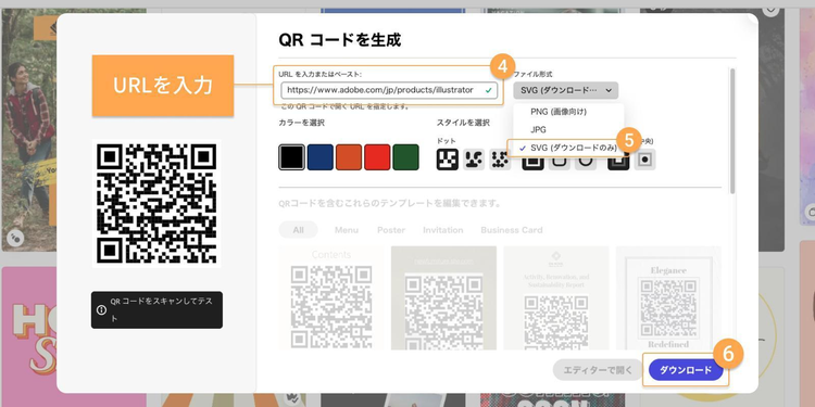 「QRコードを生成」ウィンドウ内に遷移先のURLを入力したら、「ファイル形式」から「SVG」を選んでダウンロードしてください。