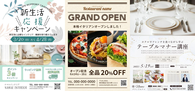 そのため、チラシはもちろん、ポスターやパンフレットなど、サイズの異なる販促アイテムにも使い回せて便利です。