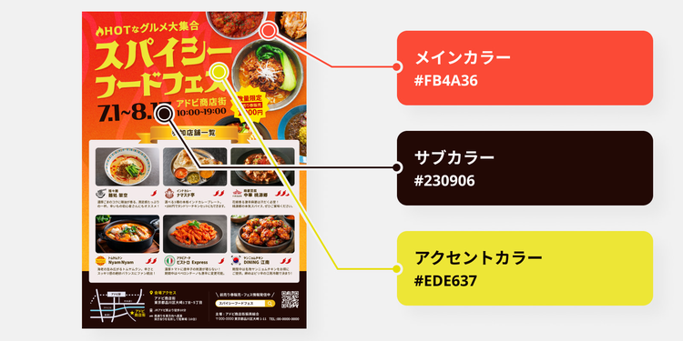 今回は「商店街で開催されるスパイシーフードフェス」のチラシを想定し、以下のように情報をまとめてみました。
