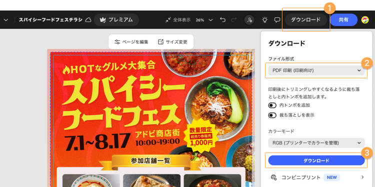 チラシが完成したら「ダウンロード」ボタンをクリックし、ファイル形式を選んで保存しましょう。