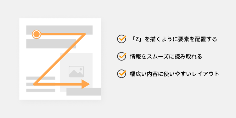 人の視線は、左上→右上→左下→右下へと「Z」を描くように流れることが多いため、この動きを意識して情報を並べると伝わりやすくなります。