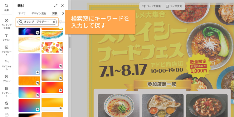背景画像が設定されていないテンプレートの場合は、「コンテンツを追加」>「素材」>「背景」の順に進み、検索窓からイメージに合うものを探しましょう。