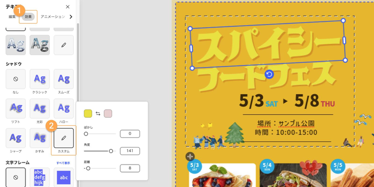 今回は、タイトル部分のテキストに「効果」から「シャドウ」を使い、影を付けて立体感を出してみました。