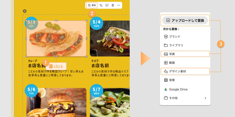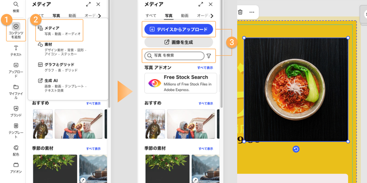 手持ちの画像を使う場合は「アップロードして置換」を、Adobe Expressで提供されている素材を使う場合は「写真」や「デザイン素材」などから選びましょう。