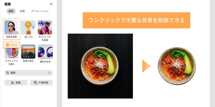 画像をクリックした状態で「背景を削除」を選択すると、被写体のみが自動で切り抜かれます。