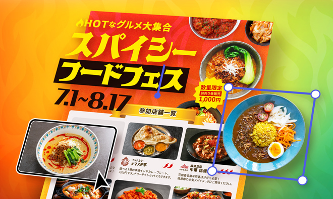 背景を取り除くことで、料理や商品を大きく印象的に見せられるだけでなく、文字やアイコンといった他の要素と組み合わせたレイアウトもしやすくなります。