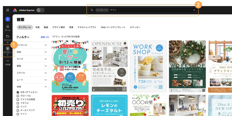 まずは、Adobe Expressのテンプレートから、チラシデザインのアイデアを探してみましょう。