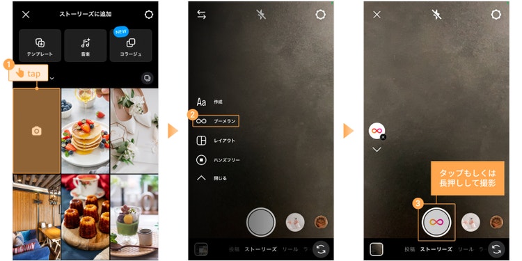 Instagramのプロフィールページの右上の「+」アイコンをタップし、「ストーリーズ」を選択します。 その後、左上の「カメラ」をタップし撮影画面を開き、「ブーメラン」を選択してください。 シャッターボタンをタップ、もしくは長押しすると撮影が始まります。