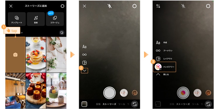 プロフィールページの右上の「+」アイコンをタップし、「ストーリーズ」を選択します。 その後、左上の「カメラ」をタップし撮影画面を開きます。 左側にある「v」マークをタップするとメニューが開き、「ハンズフリー」を選択できるようになります。