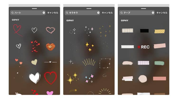 ストーリーズだけでなく、DM(ダイレクトメッセージ)やインスタライブでも使用できるので、お気に入りのGIFスタンプを見付けてみましょう。「ハート」や「キラキラ」など、スタンプのイメージを表すキーワードで検索すると、いろいろなスタンプが表示されますよ。