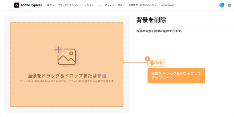 以下のリンクから Adobe Expressのトップページにアクセスし、ログインしてください。 以下の画面が開くので、加工したい画像を画面上にドラッグ&ドロップしてください。