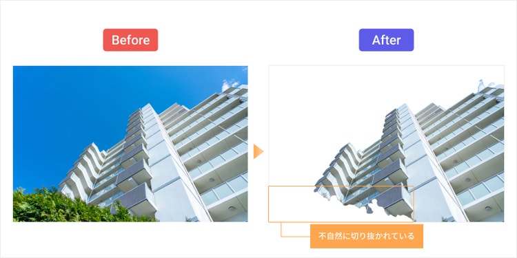 先ほど使ったサンプル写真は、背景をキレイに切り抜くことができましたが、写真によっては余計な背景が残ったり、残したい部分まで削除される場合があります。 例えば以下の左側の画像を切り抜くと、右のように木が削除されて建物が不自然に切り抜かれます。